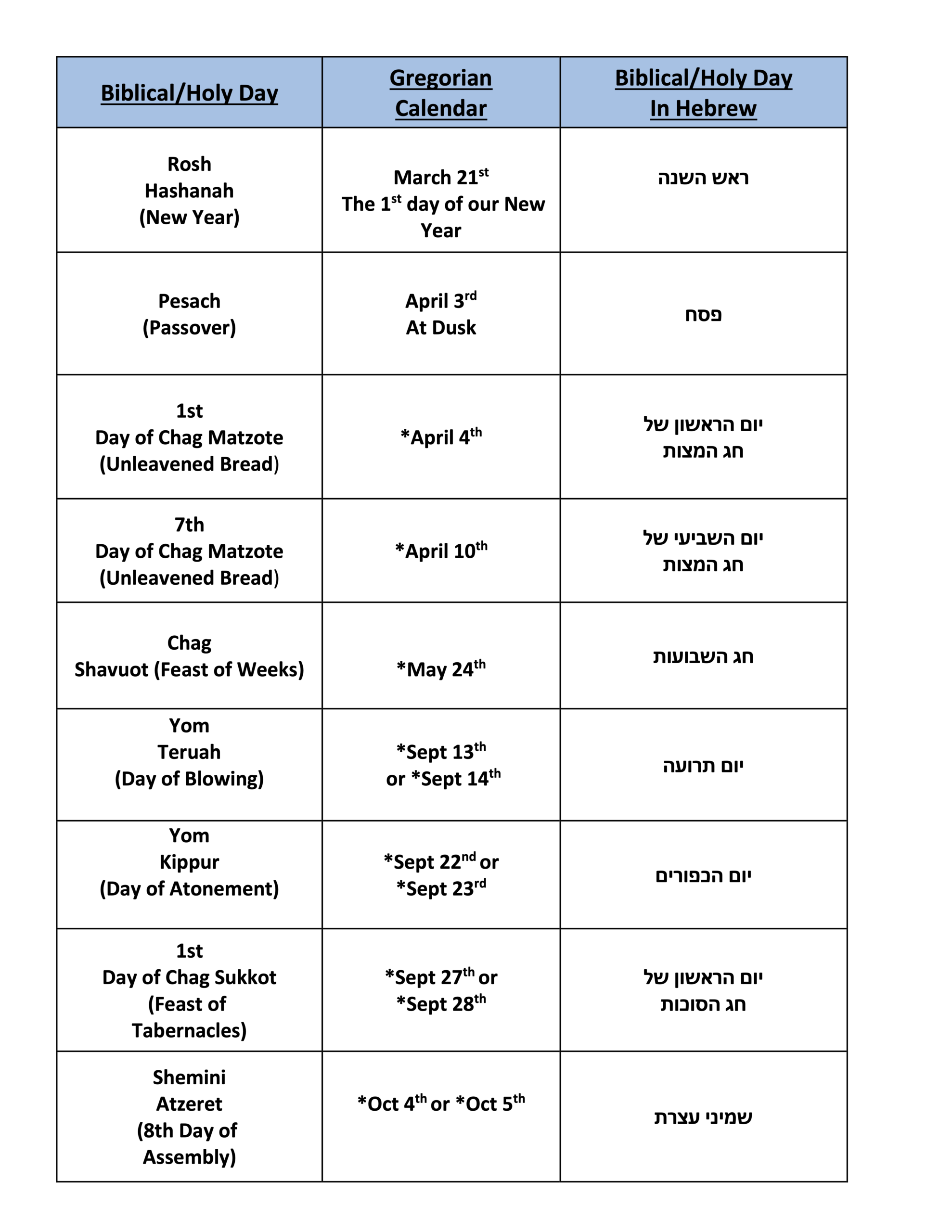 The asterisk (*) means the Holy Day begins at sunset on the day before the date listed. For example: if the Feast of Weeks (Chag Shavuot) is listed as *May 23rd, then the holy day begins on May 22nd at sunset, and lasts until May 23rd at sunset.